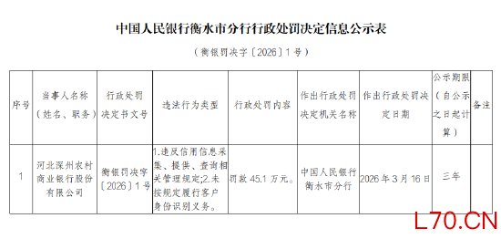 河北深州农村商业银行被罚45.1万元:未按规定履行客户身份识别义务等