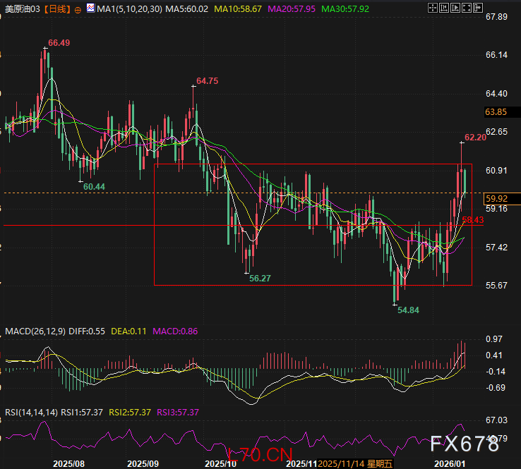目前支撑在5日线以及下方的58.43附近,压力在箱体上沿。