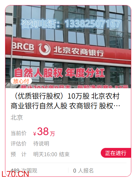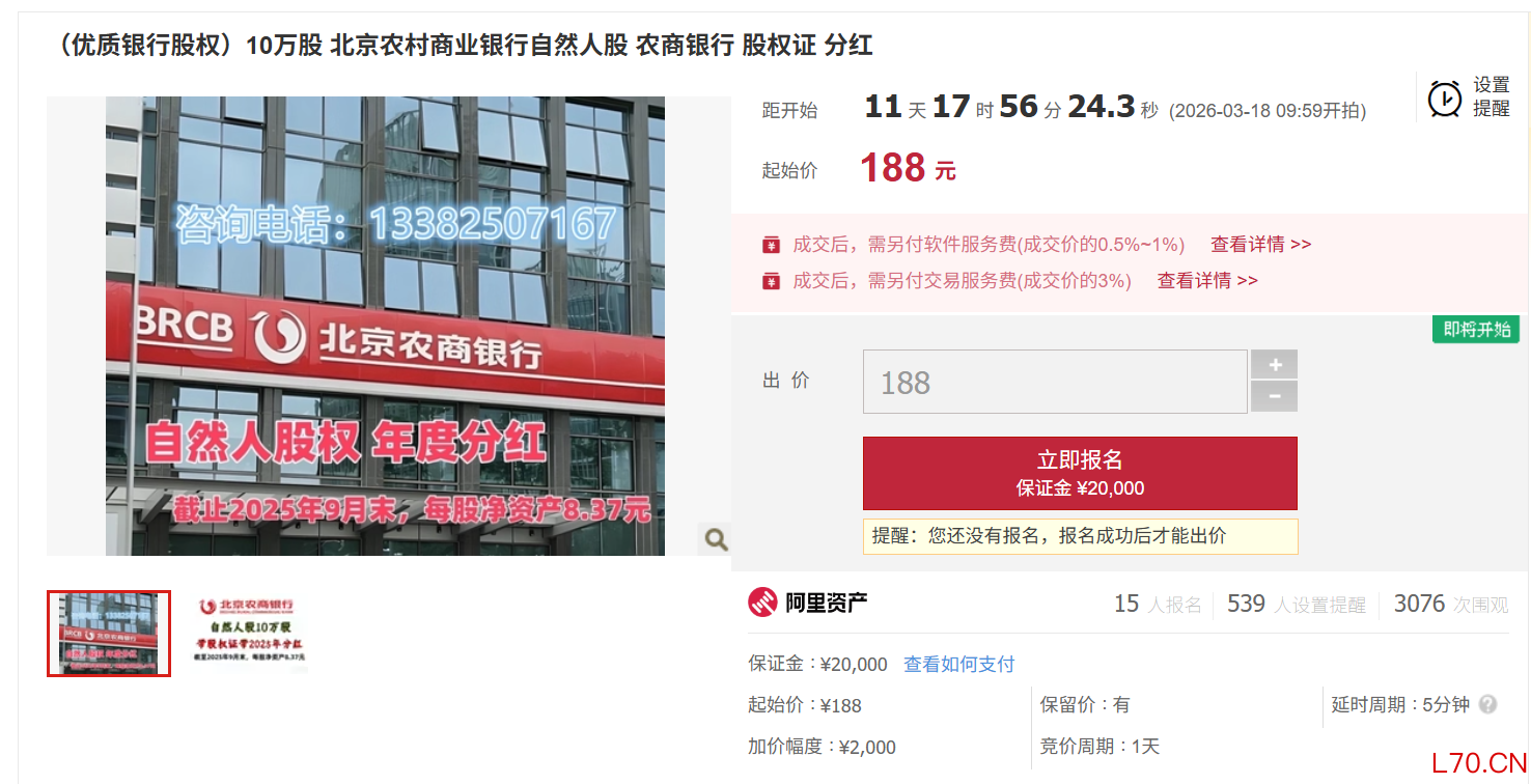 3月初,一则拍卖信息引发广泛关注:北京农商银行10万股自然人股权在阿里资产平台挂牌,起拍价仅188元。这一极低起拍价,对应的却是总资产突破1.3万亿元、稳居区域头部梯队的农商行标的,价格与标的实际体量形成鲜明反差。