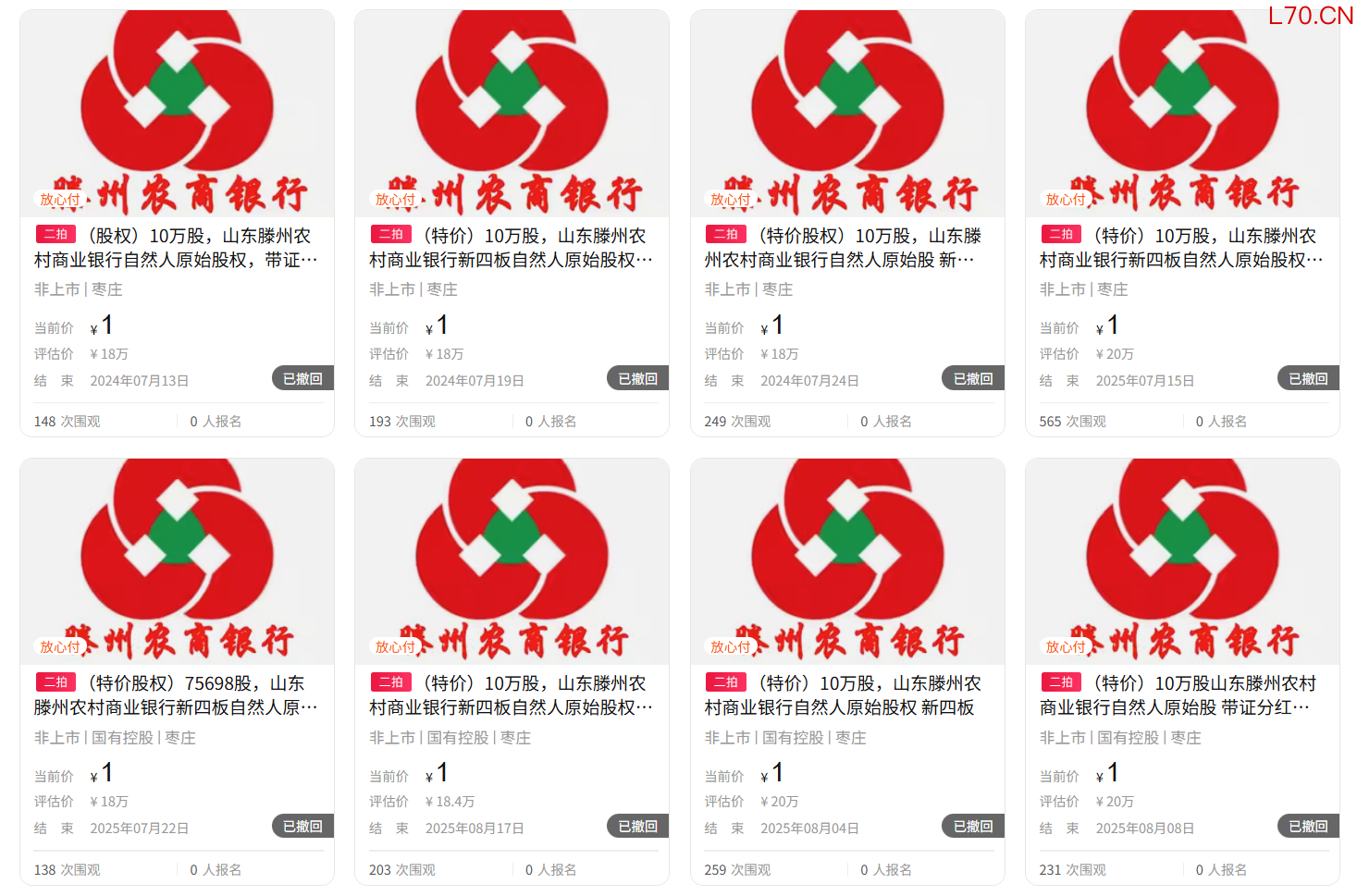 相较于优质标的的竞价成交,经营偏弱的区域性中小银行股权,即便祭出1元起拍的引流手段,也难以撬动真实投资意向,这类标的最终并未走向公开流拍,而是由委托方统一主动撤回拍卖、终止竞价流程。兰州农商行、湖口农商行、资阳农商行涉及的5万至10万股自然人股权,以及河南邓州农商行、山东滕州农商行各10万股的股权标的,其评估价普遍处于8万至25万元区间 。尽管这些标的在挂牌时均以1元的极致低价起跳,却仅收获了数百人次的零星围观;更冷酷的现实是,由于全场无一人缴纳保证金或有效报名,这些标的最终全部以“撤拍”黯然收场 。