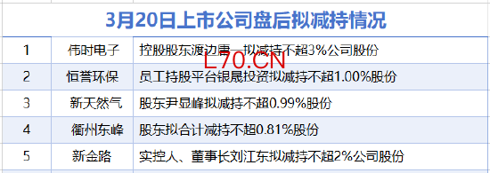 3月20日增减持汇总:新天然气等5家公司拟减持 当日暂无A股增持(表)