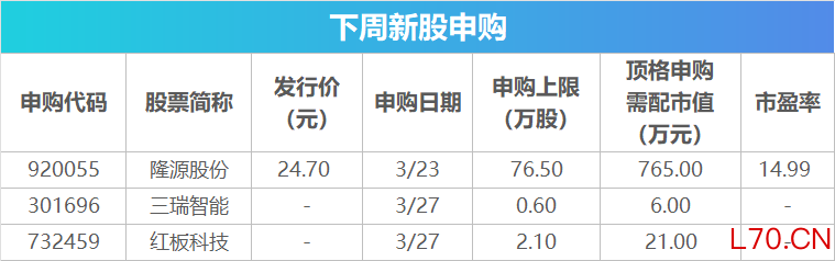 具体来看,隆源股份将于3月23日开启申购,申购代码为920055,发行价为24.70元/股。三瑞智能、红板科技将于3月27日开启申购,申购代码分别为301696和732459。