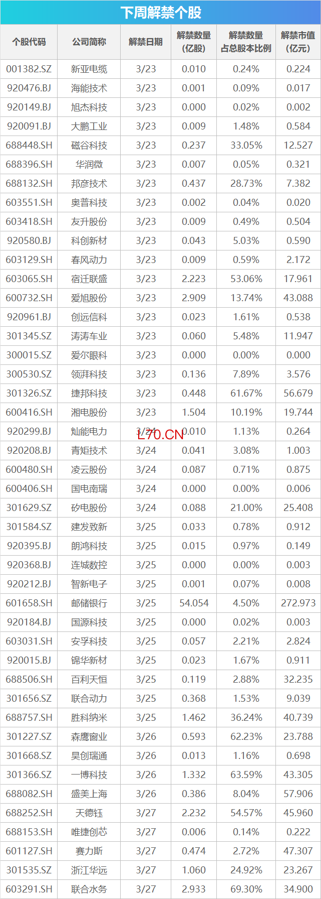 从解禁市值来看,3月25日是解禁高峰期,11家公司解禁市值合计359.79亿元,占下周解禁规模的42.7%。按最新收盘价计算,解禁市值居前三位的是:邮储银行(272.97亿元)、盛美上海(57.91亿元)、捷邦科技(56.68亿元)。从个股的解禁量看,解禁股数居前三位的是:邮储银行(54.05亿股)、联合水务(2.93亿股)、爱旭股份(2.91亿股)。